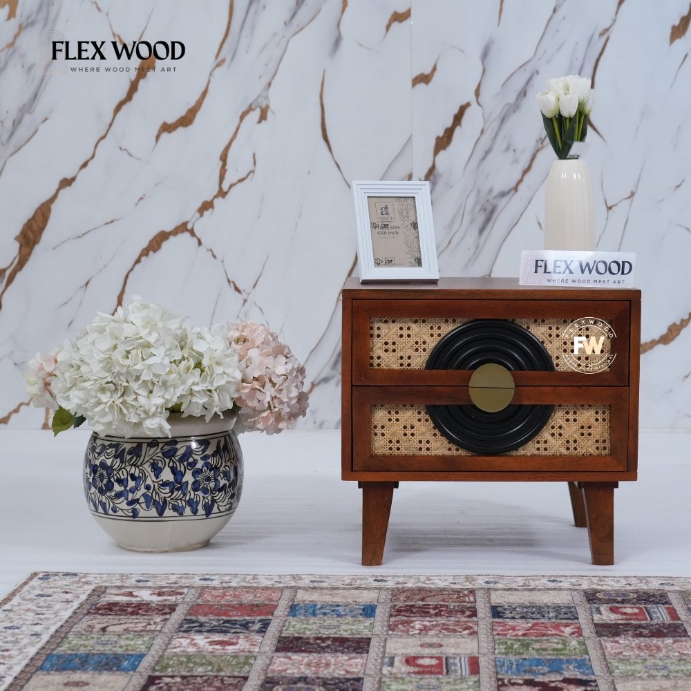 Front panel features woven cane (rattan) design for a stylish, vintage-modern look.
