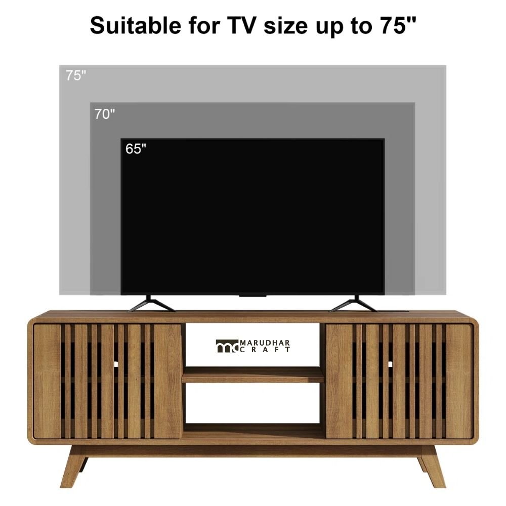 Designed to add a grand and sophisticated presence to your living room, this regal TV stand is built to support large televisions up to 75 inches with ease. The strong and stable structure ensures secure placement, while the sliding door design offers convenient access to storage without taking extra space. Its refined look makes it a striking centrepiece for Indian family living spaces.